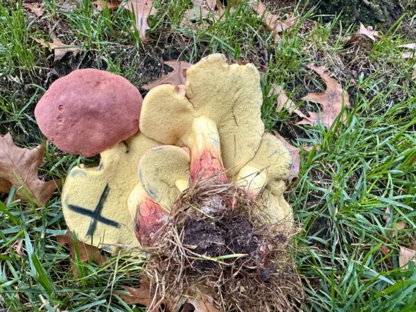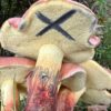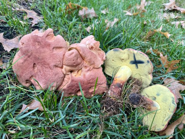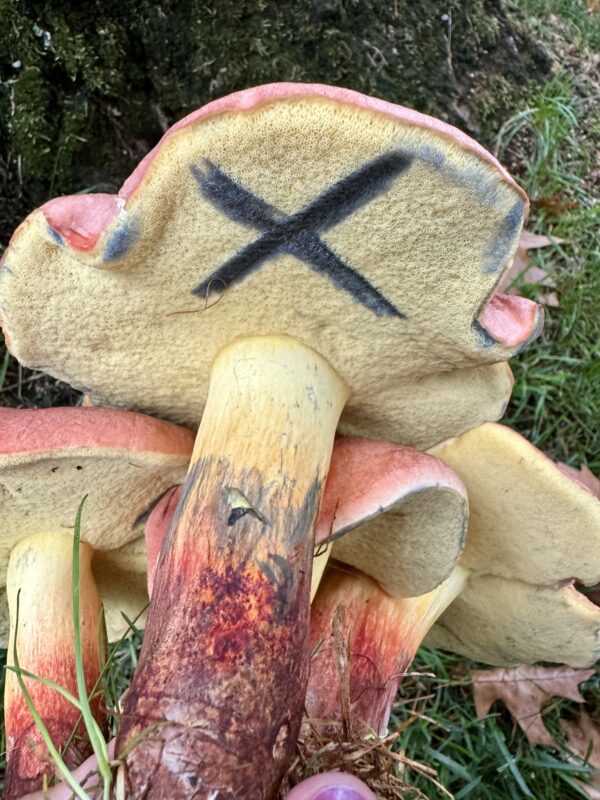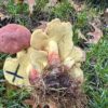 Tells: Stout red-and-yellow. White mycelium. Cap color varies from rose pink, to brick red, or even deep mahogany, fading toward brown w/age. Yellow pores and stem skin often bruise blue.